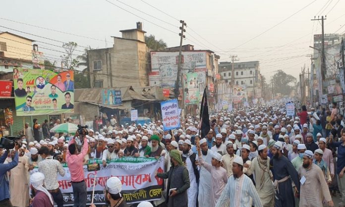 নোয়াখালী জেলার বসুরহাট পৌরসভার মেয়র কাদের মির্জার ইসলাম বিদ্বেষী অশালীন বক্তব্য ও আলেমদের সম্পর্কে মিথ্যা বক্তব্যের প্রতিবাদে এবং মিথ্যা মামলা প্রত্যাহার দাবিতে নোয়াখালীর মাইজদিতে বুধবার (১৭ ফেব্রুয়ারি) বিকেল ৫ টায় বিক্ষোভ মিছিল করে হেফাজতে ইসলাম বাংলাদেশ।