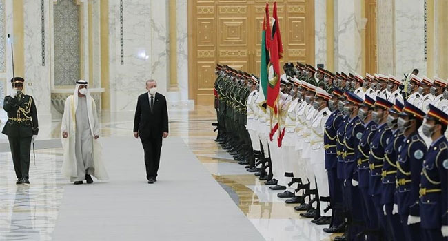 এ সময় দেশটির প্রেসিডেন্টের সরকারি প্রাসাদ ‘কাসর আল ওয়াতানে’ তুর্কি প্রেসিডেন্টকে উষ্ণ অভ্যর্থনা জানান সংযুক্ত আরব আমিরাতে কার্যত শাসক ও আবুধাবির যুবরাজ মোহাম্মদ বিন জায়েদ।