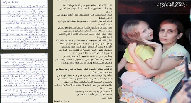 ‘আমার মেয়ে নিজেকে গাজার রানি মনে করত… আপনাদের মানবতার জন্য আপনাদের কাছে শুকরিয়া। আপনারা ছিলেন আমার সন্তানের কাছে প্রিয় মানুষ।’ কথাগুলো লিখে গেছেন গাজাভিত্তিক ফিলিস্তিনি প্রতিরোধ আন্দোলন হামাসের মুক্তি দেয়া এক ইসরাইলি বন্দী। তাকে সময় দেয়ার জন্য, পরিবারের সদস্যের মতো ব্যবহার করার জন্য হামাস সদস্যদের উচ্ছ্বসিত ভাষায় প্রশংসা করেন তিনি।