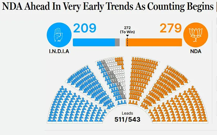ভারতে লোকসভা নির্বাচনের ফল গণনা চলছে। দিনশেষে কার গলায় উঠবে জয়ের মালা, ক্ষমতাসীন এনডিএ নাকি বিরোধী ইন্ডিয়া জোট? এ প্রশ্নে টেলিভিশনের পর্দায় চোখ আটকে আছে কোটি কোটি মানুষের। ভারত তো অবশ্যই, বিশ্বজুড়ে অসংখ্য মানুষ তাকিয়ে আছে এর দিকে। আজ সকালে ভোট গণনা শুরু হওয়ার পর প্রাথমিকভাবে যে ফল পাওয়া যাচ্ছে তাতে প্রধানমন্ত্রী নরেন্দ্র মোদির জোট এনডিএ এগিয়ে আছে। যেহেতু ভোট গণনা চলছে, তাই এ হিসাব দ্রুত পরিবর্তন হচ্ছে। এই মুহূর্তে এনডিএ জোট এগিয়ে আছে ২৭৯ আসনে। রাহুল গান্ধীর কংগ্রেস নেতৃত্বাধীন ইন্ডিয়া জোট এগিয়ে আছে ২১২ আসনে। এখনও ফল গণনার অনেক বাকি। ফলে এই হিসাবের ওপর ভিত্তি করে কোনো কথাই বলা যায় না, কে আসবেন ক্ষমতায়। মোদিই কি হ্যাটট্রিক করবেন, নাকি অন্য কেউ নতুন করে ক্ষমতায় আসবেন! এ নিয়ে এক শ্বাসরুদ্ধ প্রতীক্ষা সবার।