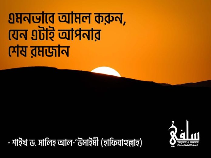 ❝সুতরাং হে মুমিনগণ, বেশি বেশি ভালোকাজ করে এবং পাপাচারিতা থেকে বিরত থেকে আপনারা আপনাদের মাসকে গৌরবান্বিত করুন।মনে রাখবেন, বেশি বেশি ভালোকাজ না করে এবং পাপাচারিতায় অটল থেকে আমাদের এ মাসকে কেউ বরণ করবে, তা বড়োই বঞ্চনার। নিশ্চয় এ কাজ সে ব্যক্তিই করে থাকে, যার প্রবৃত্তি তাকে পরাভূত করেছে এবং শয়তান যাকে আহ্বান করেছে, আর সে শয়তানকে সন্তুষ্ট করে তার আনুগত্যে লিপ্ত হয়েছে। বেঁচে থাকুন প্রবৃত্তি ও শয়তানের অনুসরণ থেকে। জোর প্রচেষ্টা চালান রহমানের আনুগত্যে।