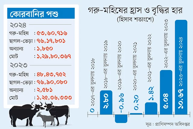 এ অবস্থায় ছাগল–ভেড়াসহ কোরবানিযোগ্য অন্যান্য পশু কমলেও এবার বেড়েছে মূলত গরু ও মহিষের সংখ্যা। গতবারের তুলনায় এবার ঈদুল আজহায় গরু ও মহিষের সংখ্যা ৫ লাখ ১৬ হাজার বেশি। অর্থাৎ এবার গরু–মহিষের সংখ্যা বেড়েছে প্রায় ১১ শতাংশ (১০.৬৭%), যা সাত বছরের মধ্যে সর্বোচ্চ বৃদ্ধি।