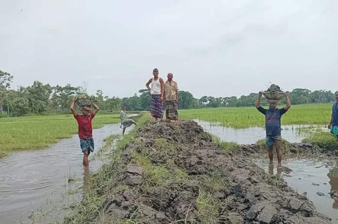 বিস্তীর্ণ ফসলের মাঠ। আশপাশে যাতায়াতের কোনো রাস্তা নেই। ঘরে ফসল তুলতে কৃষকদের ভোগান্তি পোহাতে হয়। তাই চলাচলের দুর্ভোগ কমাতে ১০ গ্রামের মানুষ স্বেচ্ছাশ্রমে দেড় কিলোমিটার সড়ক তৈরির কাজ শুরু করেছেন। ইতিমধ্যে এক কিলোমিটার সড়ক নির্মাণের কাজ শেষ হয়েছে।