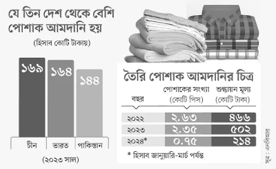 জাতীয় রাজস্ব বোর্ডের (এনবিআর) তথ্যানুযায়ী, গত বছর বৈধপথে দেশে ২ কোটি ৩৫ লাখ পিস তৈরি পোশাক আমদানি হয়েছে। যার আর্থিক মূল্য প্রায় ৫০২ কোটি টাকা। অবশ্য ২০২২ সালে ২ কোটি ৬৩ লাখ পিস পোশাক আমদানি হয়েছিল। তখন খরচ হয়েছিল ৪৬৬ কোটি টাকা। মূলত গত বছর ডলারের দাম বেড়ে যাওয়ায় পরিমাণে কম পোশাক আমদানি হলেও খরচ বেশি হয়েছে ব্যবসায়ীদের।