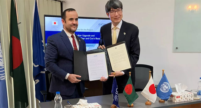 সোমবার বাংলাদেশে জাপানের রাষ্ট্রদূত ইওয়ামা কিমিনোরি এবং আইওএম বাংলাদেশের চিফ অব মিশন আবদুস সাত্তার এসোয়েভ এ সংক্রান্ত একটি এক্সচেঞ্জ অব নোটস (দ্বিপক্ষীয় বেসরকারি চুক্তি) সই করেন।