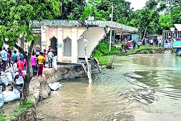 এ ছাড়া আগামী ৪৮ ঘণ্টায় এই নদীর পানি আরও বাড়তে পারে। বন্যায় তলিয়ে যাচ্ছে অনেক জেলার নিম্নাঞ্চল। আগামী ২৪ ঘণ্টায় কুড়িগ্রাম, গাইবান্ধা, জামালপুর, বগুড়া, টাঙ্গাইল, সিরাজগঞ্জ, পাবনা মানিকগঞ্জ, রাজবাড়ী এবং ফরিদপুর জেলার নিম্নাঞ্চলে বন্যা পরিস্থিতির অবনতি হতে পারে বলে গতকাল জানিয়েছে বন্যা পূর্বাভাস ও সতর্কীকরণ কেন্দ্র। বন্যা পূর্বাভাস ও সতর্কীকরণ কেন্দ্র জানায়, আগামী ২৪ ঘণ্টায় কুড়িগ্রাম, গাইবান্ধা, জামালপুর, বগুড়া, টাঙ্গাইল, সিরাজগঞ্জ, পাবনা মানিকগঞ্জ, রাজবাড়ী ও ফরিদপুর জেলার নিম্নাঞ্চলে বন্যা পরিস্থিতির অবনতি হতে পারে। বাড়তে পারে ব্রহ্মপুত্র নদ, পদ্মা, মনু ও খোয়াই নদীর পানি। এ ছাড়া যমুনা নদীর পানি স্থিতিশীল থাকলেও আগামী ৪৮ ঘণ্টায় পানির উচ্চতা বাড়তে পারে। তবে গঙ্গা নদীসহ দেশের উত্তর-পূর্বাঞ্চলের মেঘনা অববাহিকার প্রধান নদীগুলোর পানি কমছে। গত ২৪ ঘণ্টায় বন্যা পূর্বাভাস ও সতর্কীকরণ কেন্দ্রের স্টেশনগুলোর মধ্যে সর্বোচ্চ বৃষ্টি হয়েছে মৌলভীবাজার স্টেশনে ৯৩ মিলিমিটার। এ ছাড়া মনু রেলওয়ে ব্রিজে ৬১ মিলিমিটার বৃষ্টি হয়েছে। অন্যদিকে উজানে ভারতের স্টেশনগুলোর মধ্যে সর্বোচ্চ আইজলে বৃষ্টি হয়েছে ২৫ মিলিমিটার। এ ছাড়া দার্জিলিংয়ে ২২ মিলিমিটার বৃষ্টি রেকর্ড করা হয়েছে। এদিকে, দেশের বিভিন্নস্থানে বন্যার সর্বশেষ পরিস্থিতির তথ্য পাঠিয়েছেন আমাদের নিজস্ব প্রতিবেদক ও প্রতিনিধিরা।রংপুর : তিস্তার পানি বাড়া-কমার সঙ্গে নদীভাঙনে দিশাহারা হয়ে পড়েছেন গঙ্গাচড়ায় তিস্তাপাড়ের মানুষ। গত এক মাসে তিস্তার ভাঙনে কোলকোন্দ ইউনিয়নের বিনবিনা চরের মানচিত্র পাল্টে গেছে। সেখানে বসবাসরত তিন শতাধিক পরিবারের আবাদি জমি ও গাছপালাসহ বসতভিটা নদীগর্ভে হারিয়ে গেছে। এ ছাড়া সেখানকার প্রায় এক হাজার পরিবারসহ মটুকপুর, চিলাখাল, সাউদপাড়া, কুড়িবিশ্বা, ইচলী, পাইকান হাজীপাড়া, মিনার বাজার, ছালাপাক, মর্নেয়া চরসহ নিম্ন এলাকার প্রায় চার হাজার পরিবার গত দুই সপ্তাহ ধরে পানিবন্দী। লক্ষ্মিটারী ইউনিয়নের পশ্চিম ইচলী এলাকায় ভাঙনে বিলীন হয়েছে ১৫০ পরিবারের ঘরবাড়ি। ভাঙন অব্যাহত থাকায় বিনবিনার পাকা রাস্তাসহ স্বেচ্ছাশ্রমে নির্মিত চার কিলোমিটার বেড়ি বাঁধটি ভেঙে গেছে। এতে তিস্তার পানি ঢুকে গ্রামটির প্রায় এক হাজার পরিবার ১৫ দিন ধরে পানিবন্দী রয়েছেন।