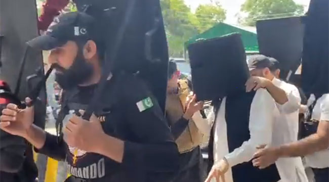 ভিডিওটিতে দেখা গেছে, ছয়জন নিরাপত্তাকর্মী কালো রঙের বড় চার কোনা বোর্ড উঁচু করে ধরে ইমরান খানকে নিরাপত্তা দিয়ে আদালত চত্বর ধরে এগিয়ে যাচ্ছেন, আর তাদের একদম মাঝখানে বালতির মতো দেখতে হেলমেট পরে এগিয়ে যাচ্ছেন ইমরান খান। চলাচলের সময় তিনি যেন হোঁচট খেয়ে না পড়ে যান, তা নিশ্চিত করার জন্য তার পেছনে এক ব্যক্তিও রয়েছেন।