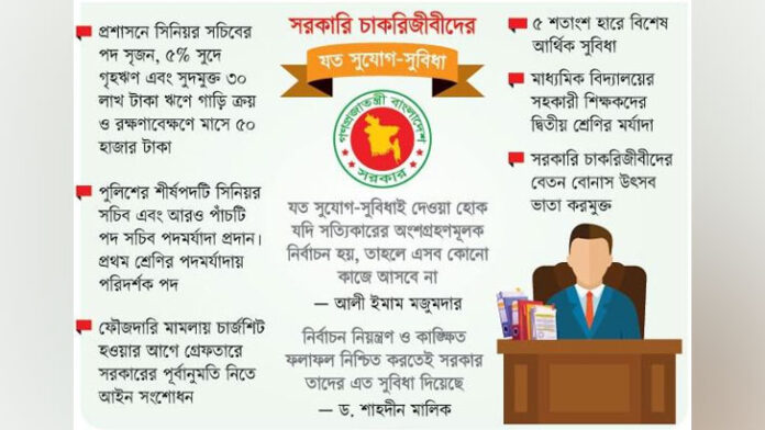 আওয়ামী লীগ সরকারের টানা সাড়ে ১৪ বছরে অঢেল সুযোগ-সুবিধা পেয়েছেন বিভিন্ন স্তরের চাকরিজীবীরা। বিশেষ করে গত দুটি (২০১৪ ও ২০১৮) নির্বাচনের আগে এবং আসন্ন জাতীয় সংসদ নির্বাচন সামনে রেখে এগুলো দেওয়া হয়েছে।