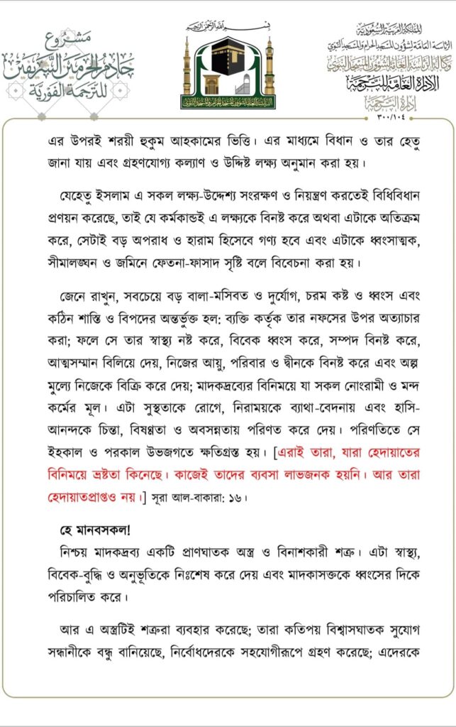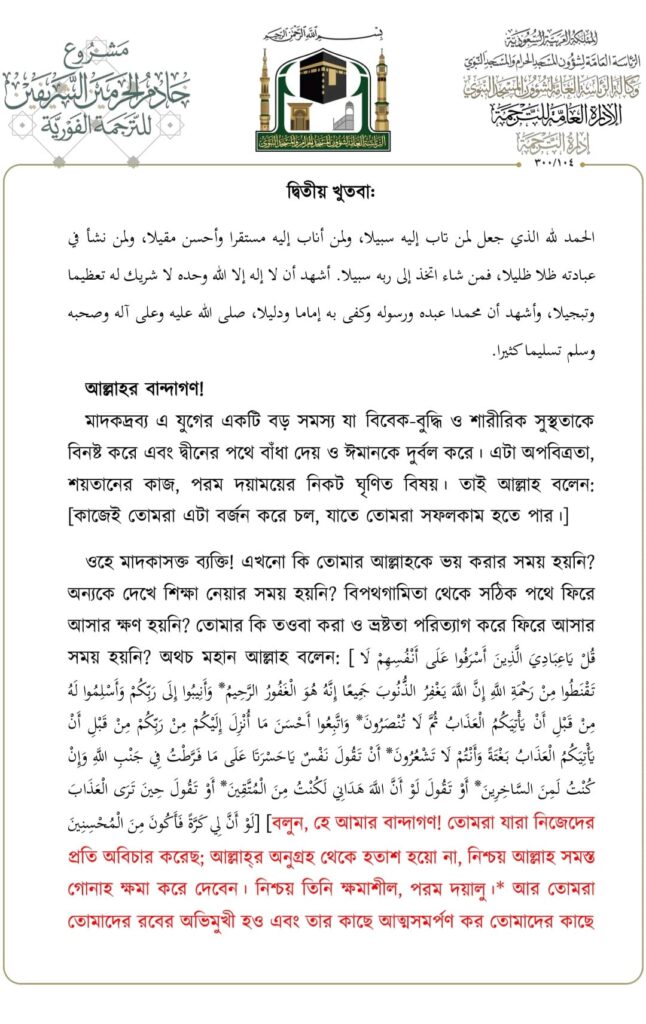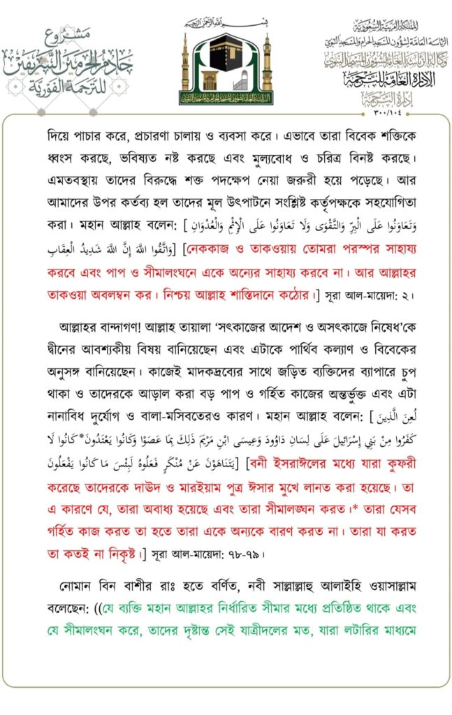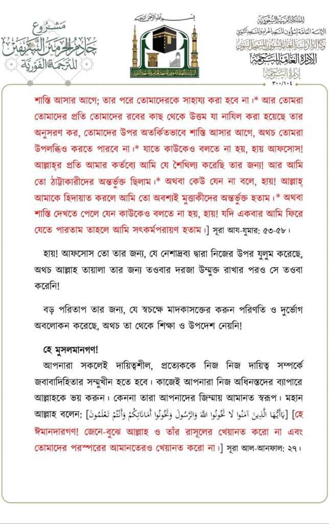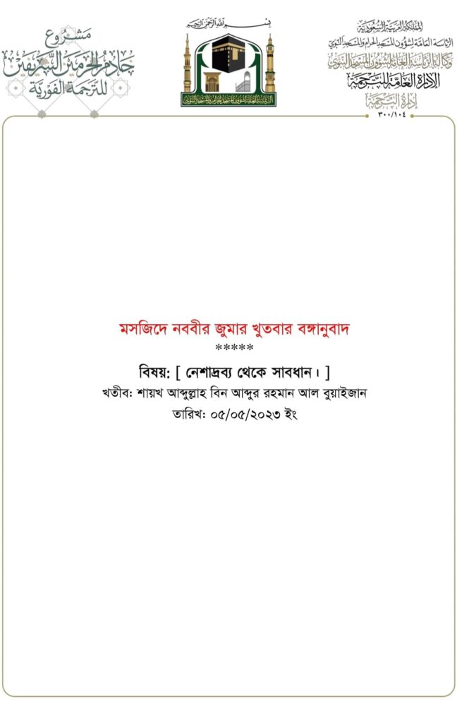 মসজিদে নববীতে প্রদত্ত জুমার খুতবার বঙ্গানুবাদ,তারিখ: ০৫/০৫/২০২৩ ইং। বিষয়: নেশাদ্রব্য থেকে সাবধান
