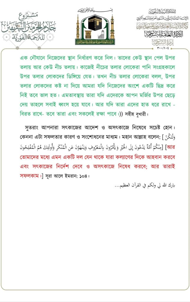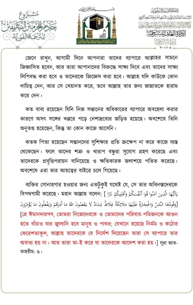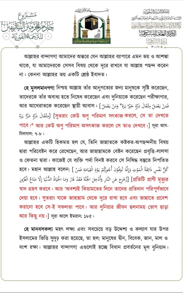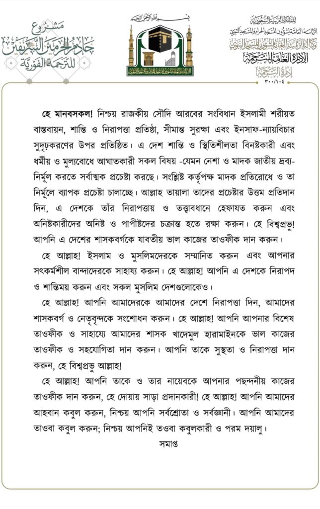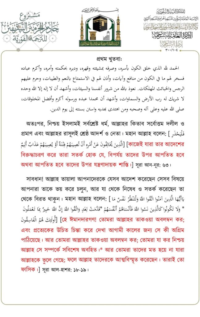 মসজিদে নববীতে প্রদত্ত জুমার খুতবার বঙ্গানুবাদ,তারিখ: ০৫/০৫/২০২৩ ইং। বিষয়: নেশাদ্রব্য থেকে সাবধান