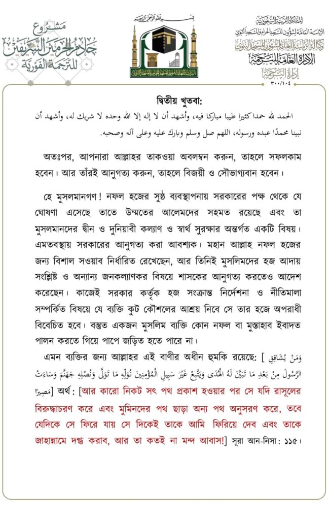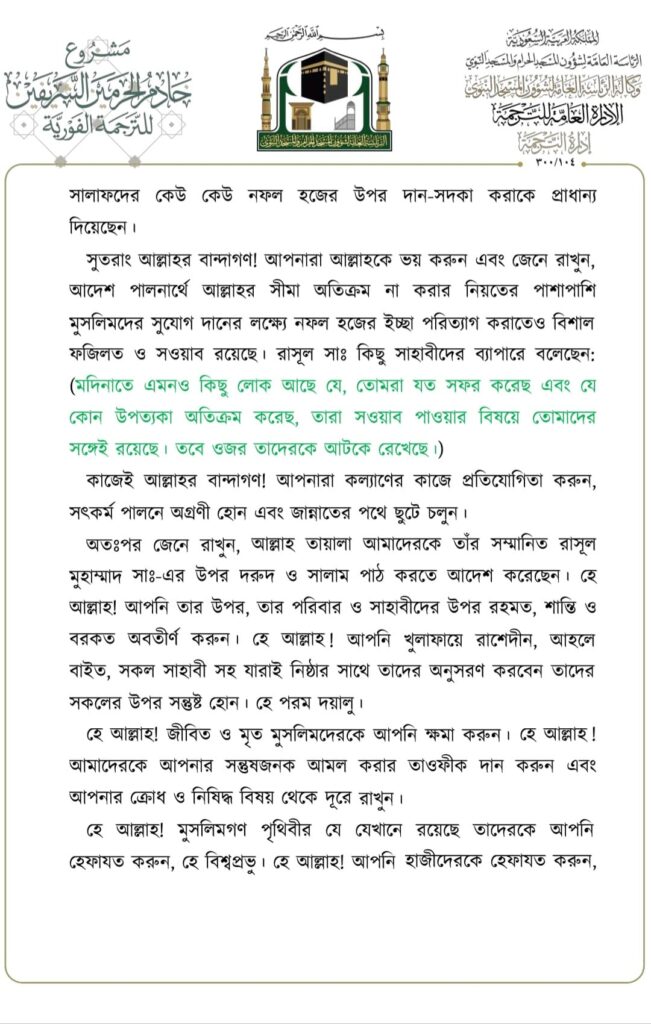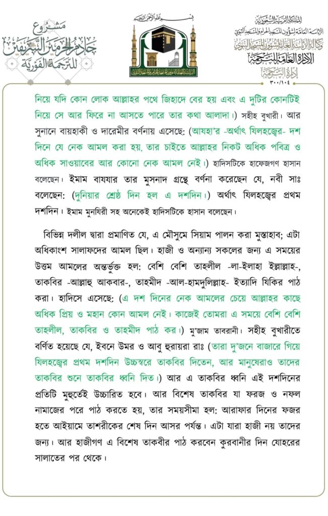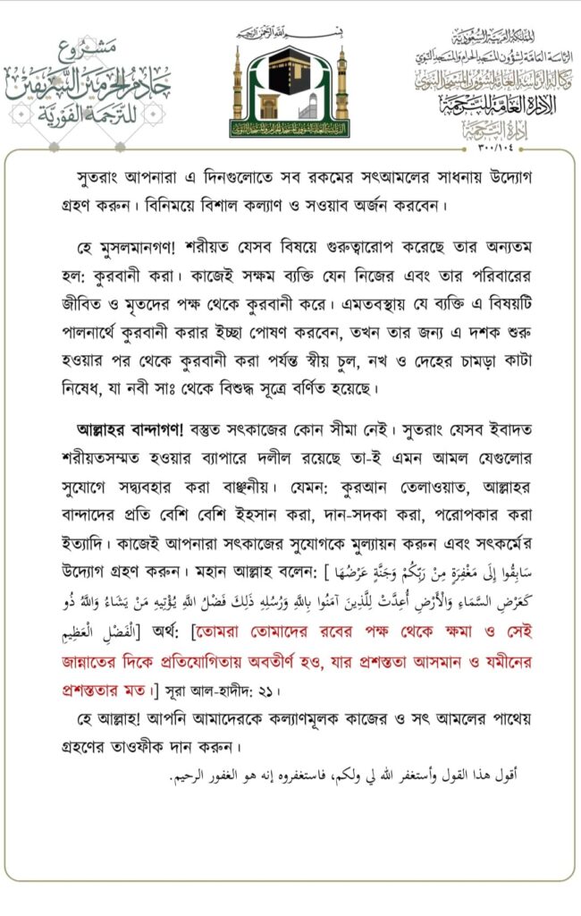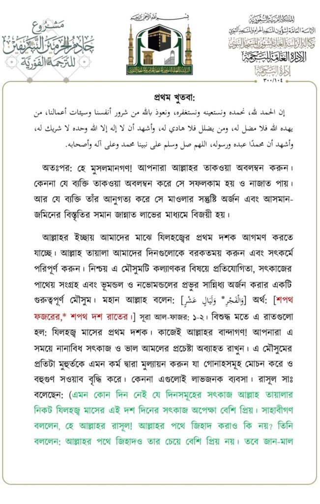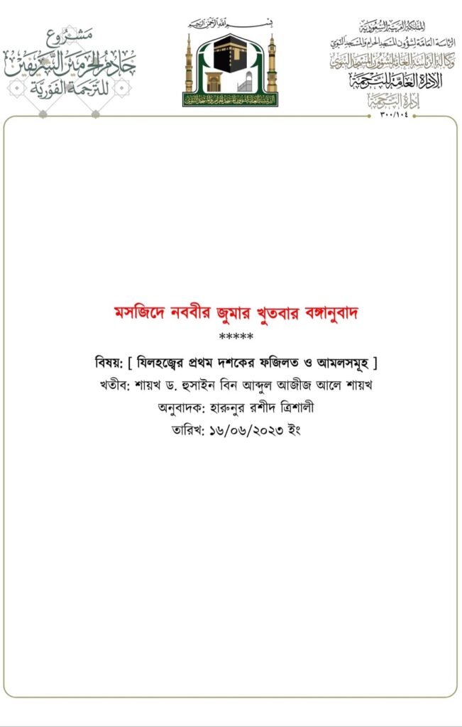 মসজিদে নববীতে প্রদত্ত জুমার খুতবার বঙ্গানুবাদ,তারিখ: ১৬/০৬/২০২৩ ইং। বিষয়: যিলহজ্বের প্রথম দশকের আমল ও ফজিলতসমূহ
