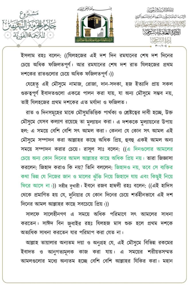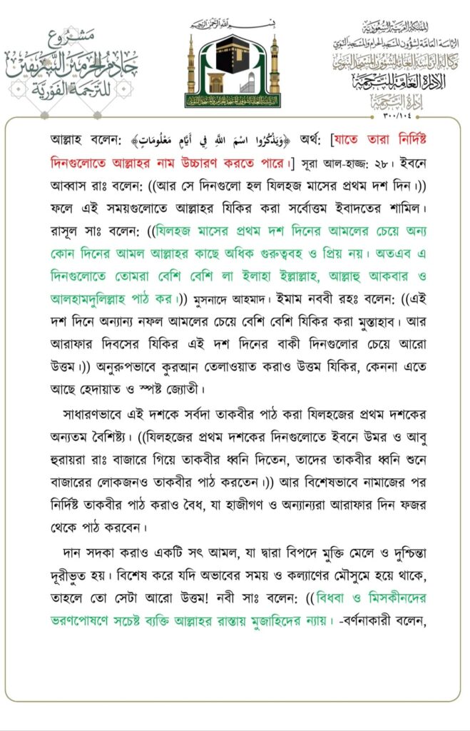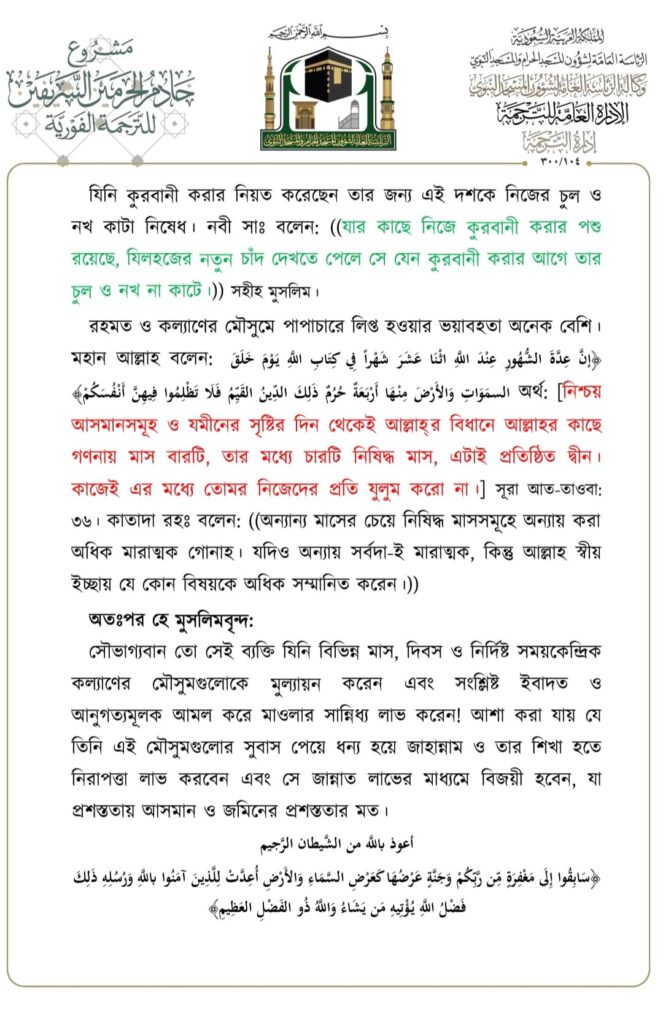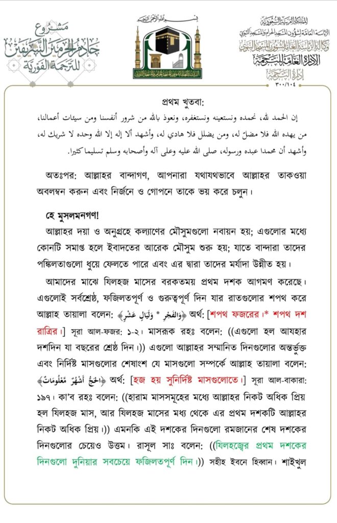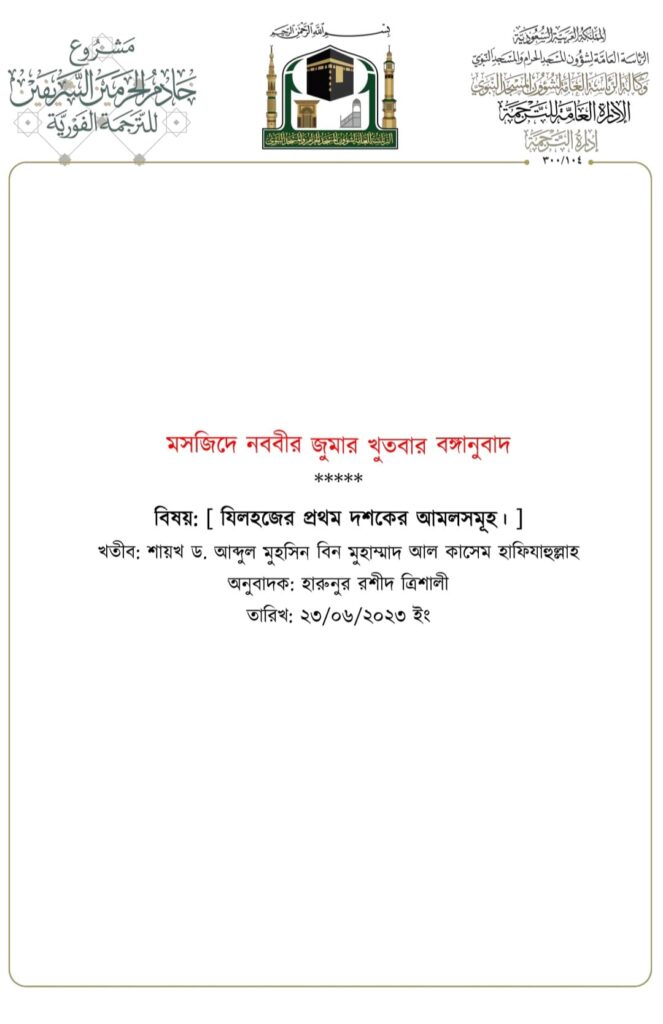 মসজিদে নববীতে প্রদত্ত জুমার খুতবার বঙ্গানুবাদ,তারিখ: ২৩/০৬/২০২৩ ইং। বিষয়: যিলহজ্জের প্রথম দশকের আমলসমূহ