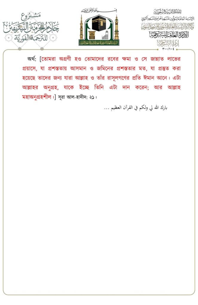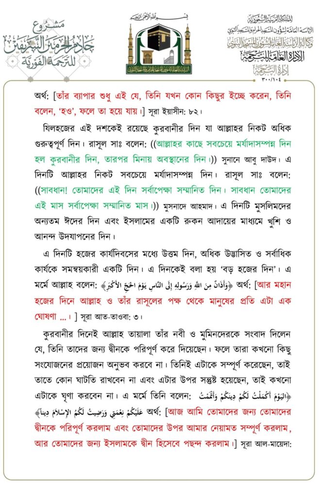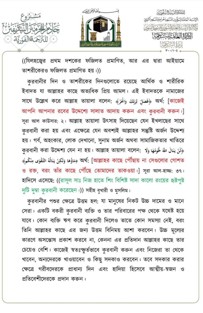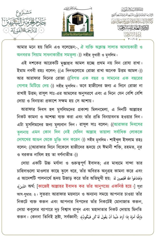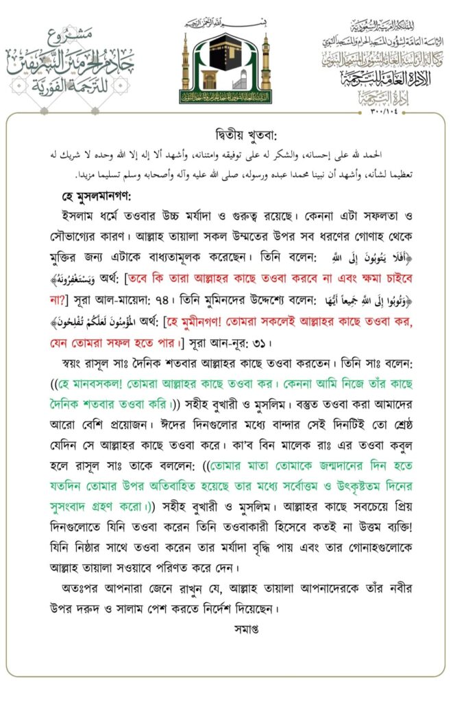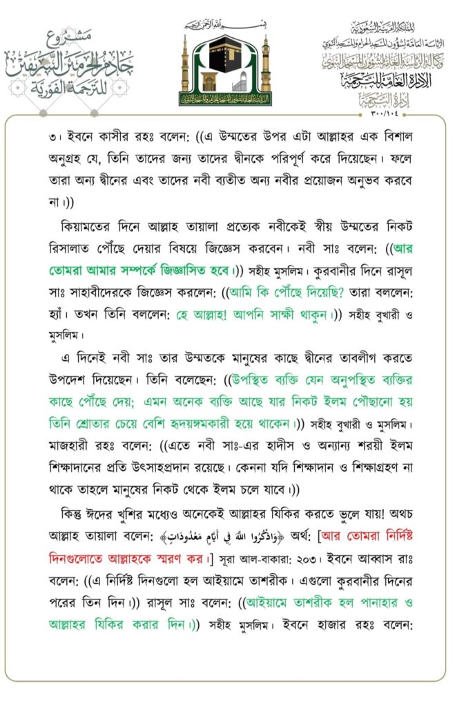 মসজিদে নববীতে প্রদত্ত জুমার খুতবার বঙ্গানুবাদ,তারিখ: ২৩/০৬/২০২৩ ইং। বিষয়: যিলহজ্জের প্রথম দশকের আমলসমূহ
