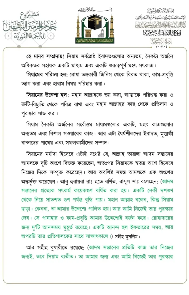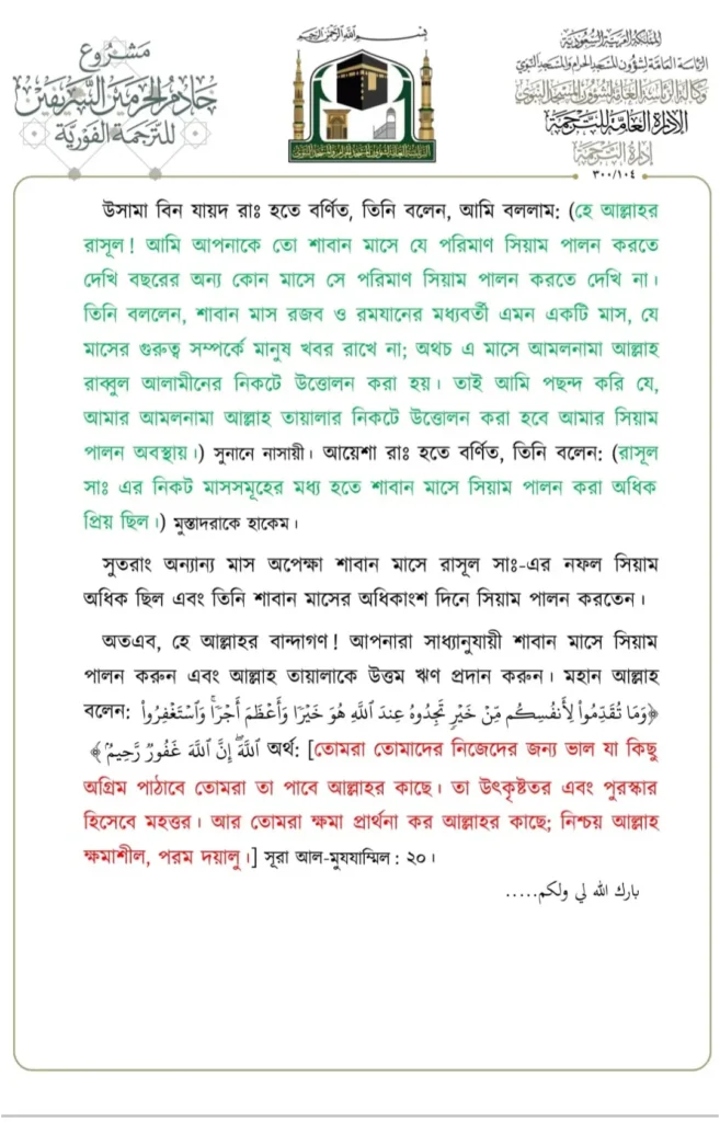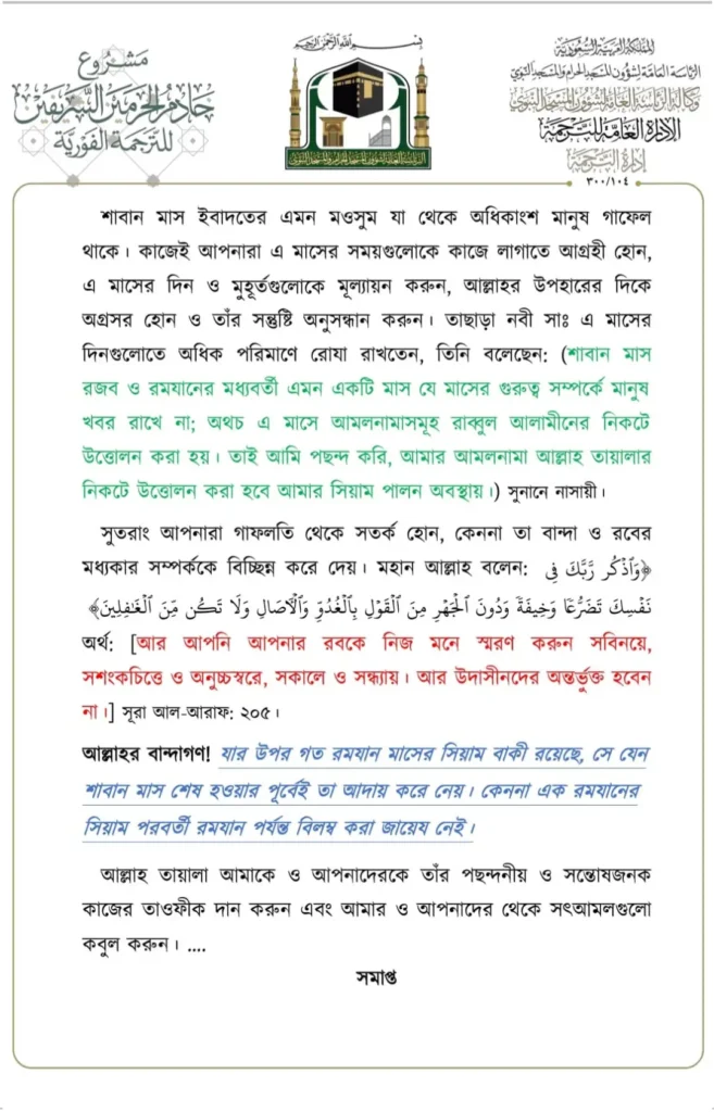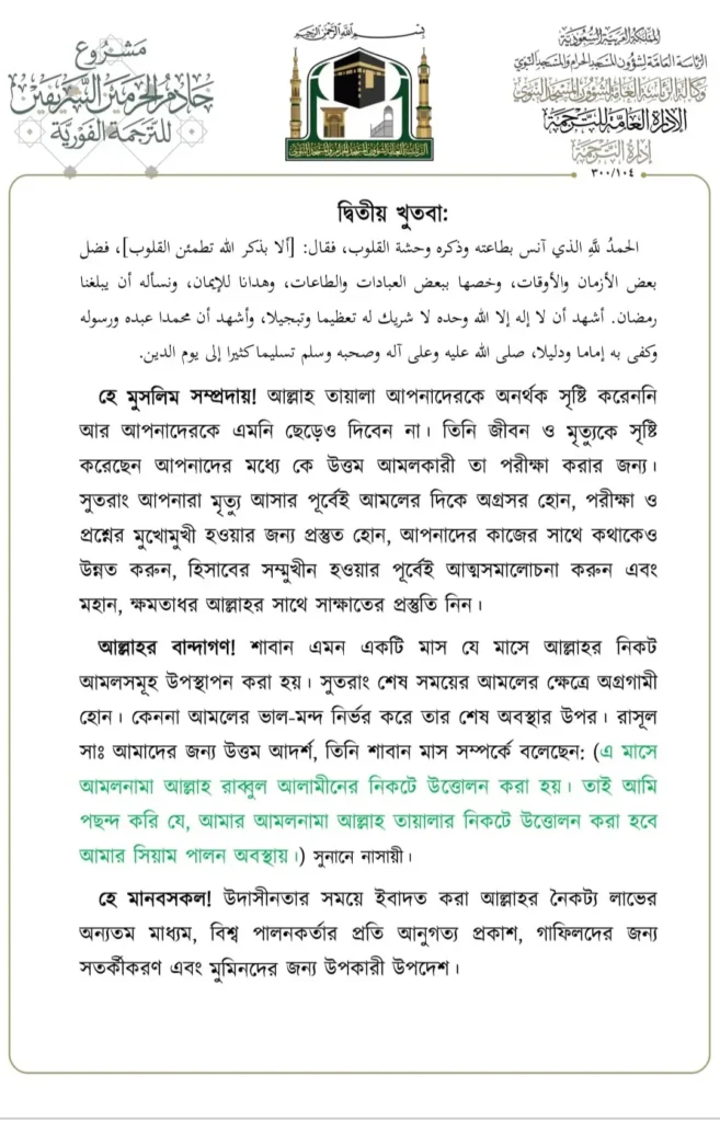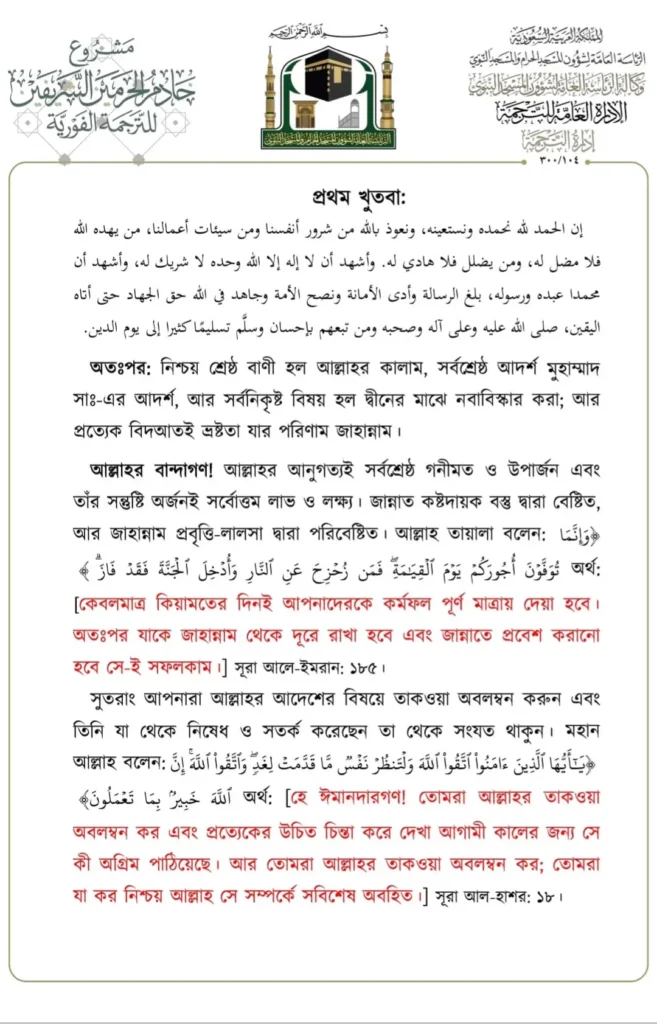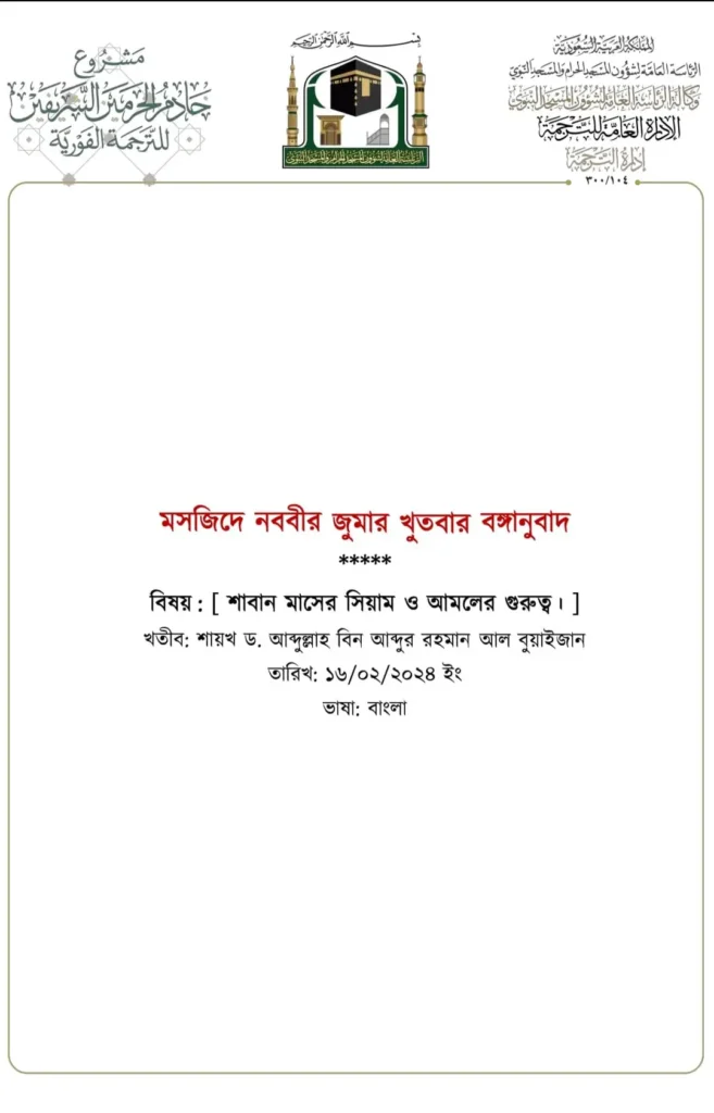 মসজিদে নববীতে প্রদত্ত জুমার খুতবার বঙ্গানুবাদ, তারিখ: ১৬/০২/২০২৪ ইং
