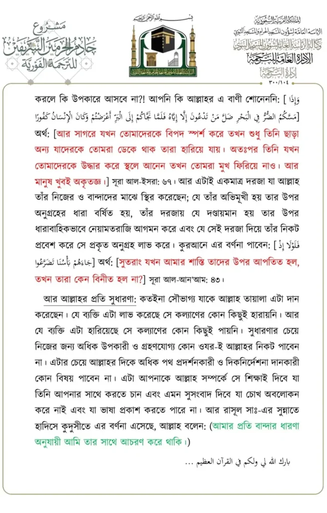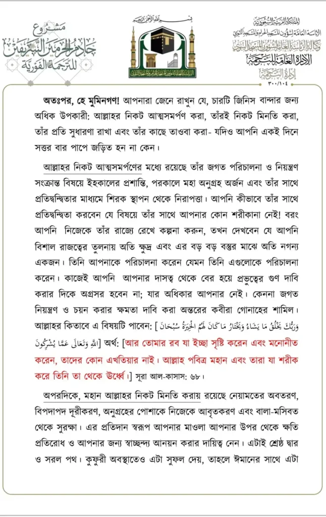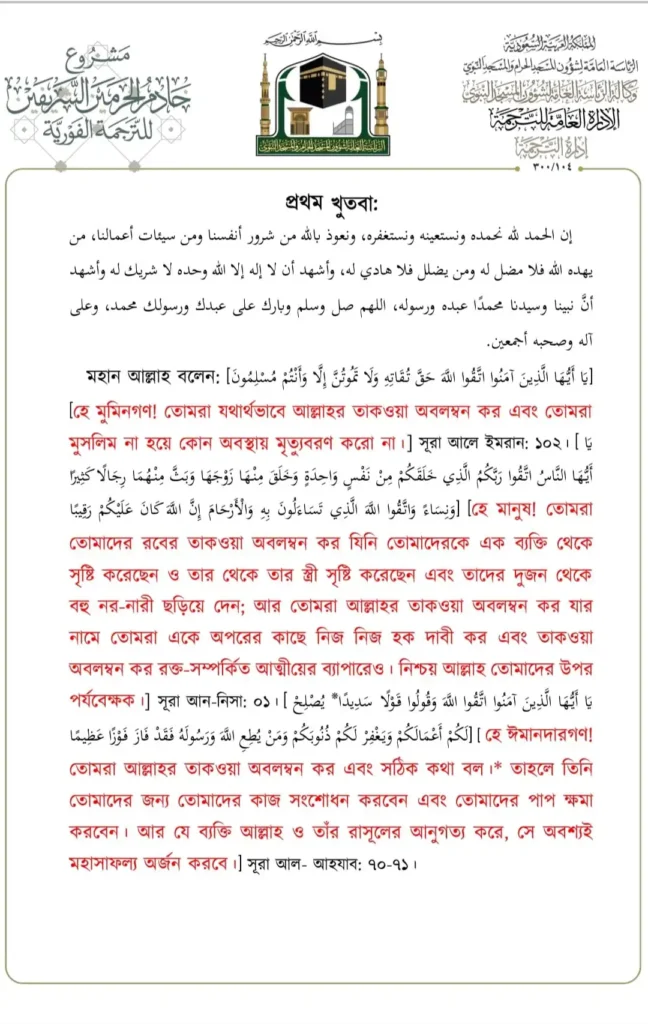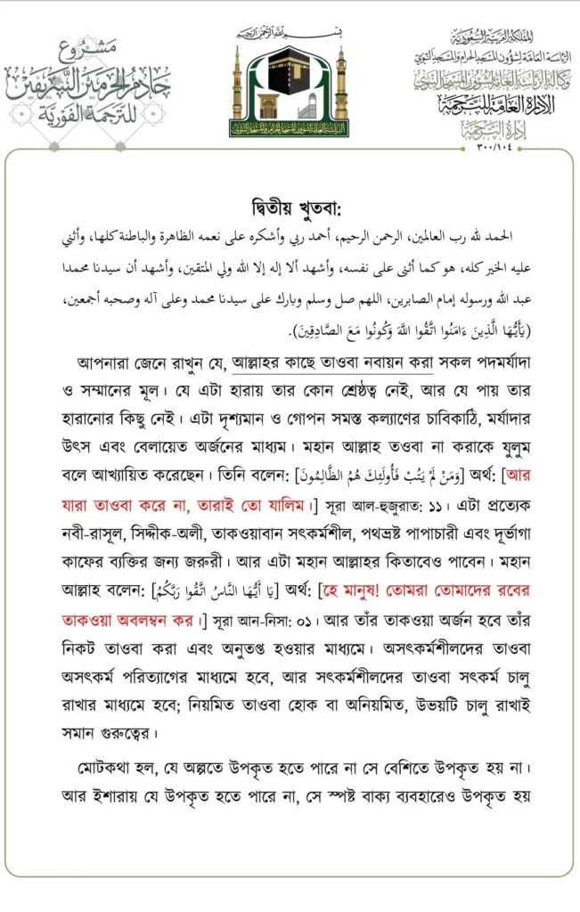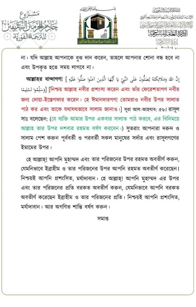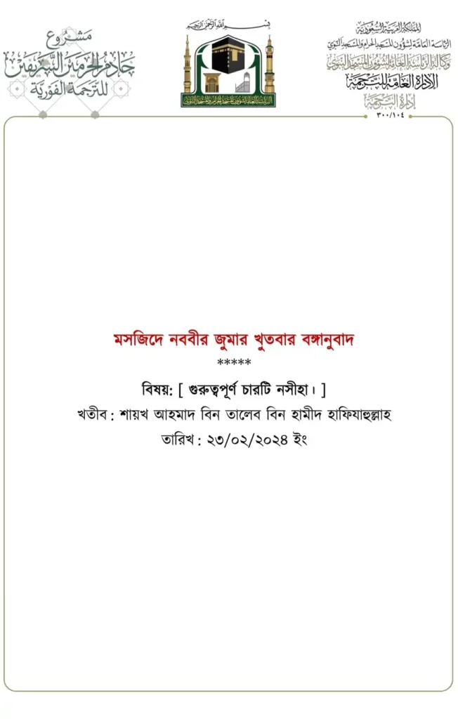 মসজিদে নববীতে প্রদত্ত জুমার খুতবার বঙ্গানুবাদ, তারিখ: ২৩/০২/২০২৪ ইং