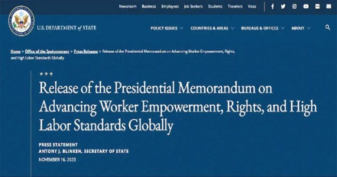প্রেসিডেন্ট বাইডেন শ্রমিকদের ক্ষমতায়ন, শ্রম অধিকার ও শ্রমিকদের মানসম্মত জীবনযাপন নিশ্চিত করার লক্ষ্যে ওই প্রেসিডেনশিয়াল মেমোরেন্ডাম সই করার পর ১৬ নভেম্বর পররাষ্ট্রমন্ত্রী অ্যান্টনি ব্লিঙ্কেন তা আনুষ্ঠানিকভাবে ঘোষণা করেছে। তিনি বলেছেন, যাঁরা শ্রমিকদের অধিকারের বিরুদ্ধে যাবেন, শ্রমিকদের হুমকি দেবেন কিংবা ভয় দেখাবেন, তাঁদের ওপর প্রয়োজনে নিষেধাজ্ঞা আরোপ করা হবে।