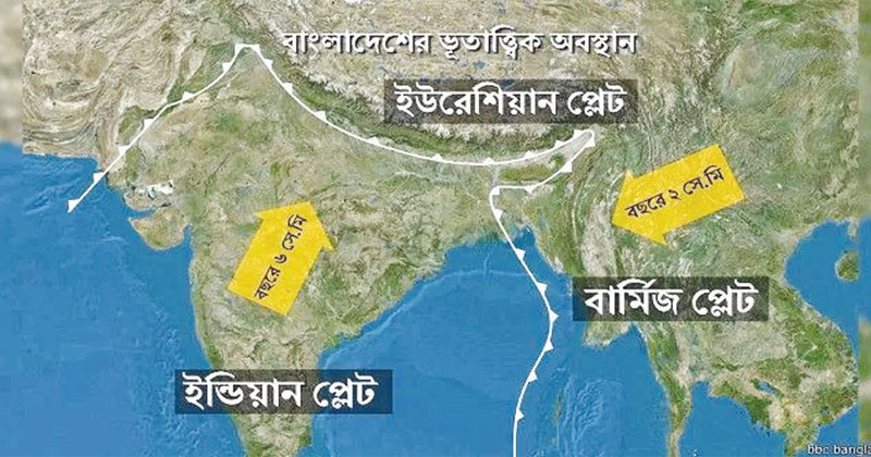 ভ‚তত্ত¡বিদদের মতে, বাংলাদেশের পার্বত্য এলাকায় ইন্ডিয়ান প্লেট ও বার্মা প্লেট নামে দুটি টেকটনিক প্লেটের অবস্থান রয়েছে। এরমধ্যে ইন্ডিয়ান প্লেটটি উত্তর-পূর্ব দিকে এবং বার্মিজ প্লেটটি পশ্চিম দিকে যাচ্ছে। ‘ফলে পরষ্পরমুখী সংঘর্ষ হচ্ছে। এই দুটি প্লেটের যে সংযোগস্থল সেটা বেশ গভীরে। বাংলাদেশের যেসব অঞ্চলে বিশেষ করে সিলেট এলাকায় যেখানে ভ‚মিকম্প হচ্ছে সেটা স্যালো ডেপথ, অর্থাৎ কম গভীর’।