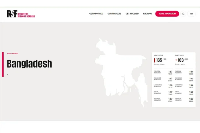 বিশ্ব সংবাদমাধ্যমের স্বাধীনতা সূচকে বাংলাদেশ গত বছরের তুলনায় দুই ধাপ পিছিয়েছে। আজ শুক্রবার (৩ মে) বিশ্ব মুক্ত গণমাধ্যম দিবসে রিপোর্টার্স উইদাউট বর্ডারস (আরএসএফ) ২০২৪ সালের এই সূচক প্রকাশ করেছে। সূচকে ১৮০টি দেশের মধ্যে বাংলাদেশের অবস্থান ১৬৫তম, স্কোর ২৭ দশমিক ৬৪। ২০২৩ সালের সূচকে বাংলাদেশের অবস্থান ছিল ১৬৩তম। স্কোর ছিল ৩৫ দশমিক ৩১।