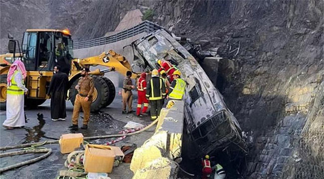 একটি সেতুর ওপর নিয়ন্ত্রণ হারিয়ে বাসটি পাহাড়ি দেয়ালে ধাক্কা খায় এবং আগুন ধরে যায়। বাসটির ব্রেকে সমস্যা হয়েছিল বলে জানানো হয়েছে সৌদি সংবাদমাধ্যমের প্রতিবেদনে।