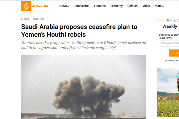 ইয়েমেনের সৃষ্ট যুদ্ধের অবসান ঘটাতে শান্তি প্রস্তাব দিয়েছে সৌদি আরব। এদিকে রিয়াদ যে শান্তি প্রস্তাব দিয়েছে তা প্রত্যাখ্যান করেছে ইয়েমেনের হুথি গোষ্ঠী।